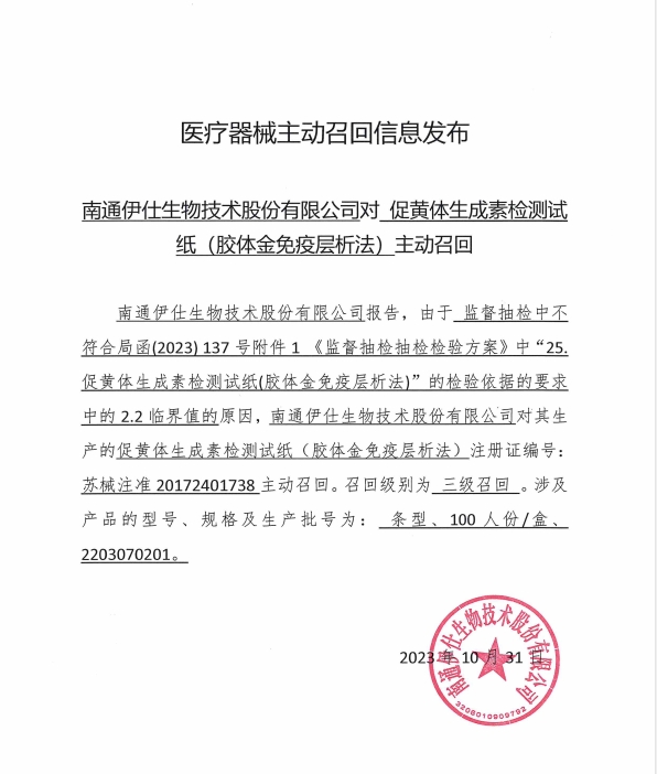 近期,南通伊仕生物技術(shù)股份有限公司生產(chǎn)的排卵檢測試紙,因第三方檢驗判定產(chǎn)品不符合技術(shù)要求中的2.2臨界值。