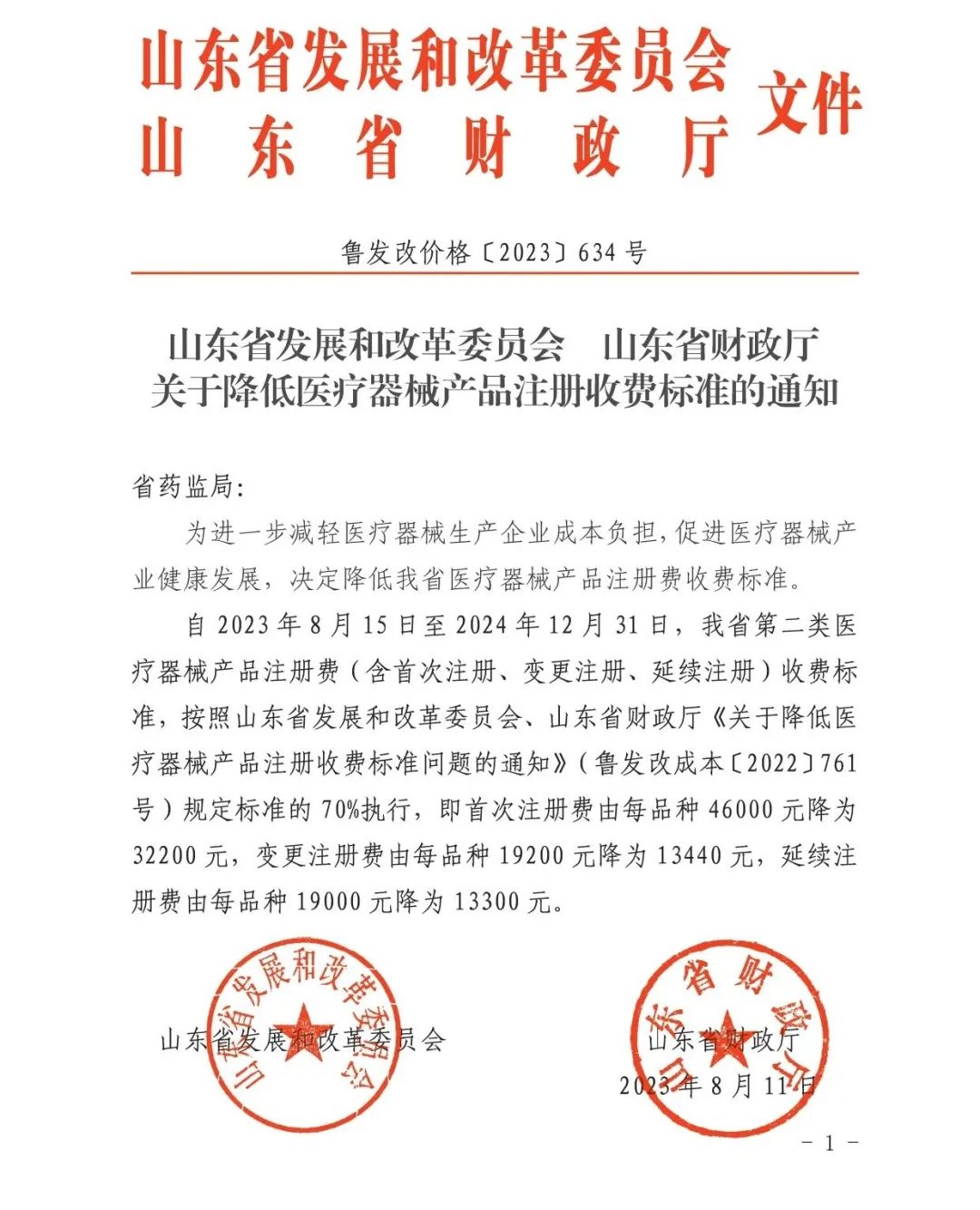 8月14日,山東省發(fā)展和改革委員會(huì)、山東省財(cái)政廳《關(guān)于降低醫(yī)療器械產(chǎn)品注冊(cè)收費(fèi)標(biāo)準(zhǔn)的通知》: