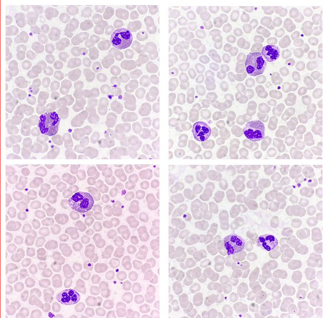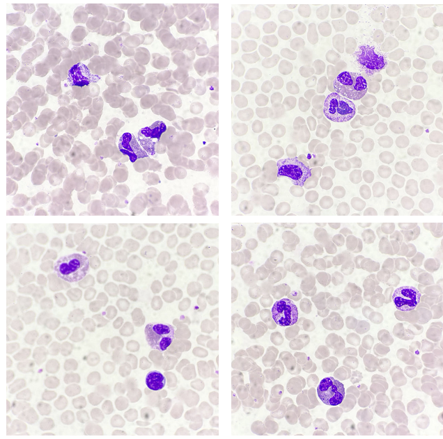 入院檢查雙耳前、耳后、頸前、頸后、腹股溝皆可扣及淋巴結(jié)腫大,質(zhì)軟,界清,易推動(dòng),部分融合。當(dāng)遇到這樣一份血液細(xì)胞形態(tài)(骨髓+外周血)送檢單時(shí),筆者首先想到的是—淋巴瘤。在鏡檢時(shí),淋巴細(xì)胞易見,未見典型的淋巴瘤細(xì)胞,取而代之的是較多的嗜酸性粒細(xì)胞,見圖1~2: