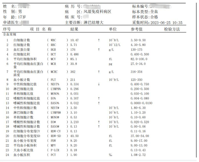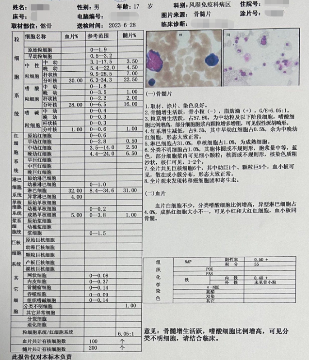 IGE:5919 IU/mL↑,血常規(guī)嗜酸性粒細(xì)胞:30.7%↑,骨髓活檢嗜酸性粒細(xì)胞易見,結(jié)合實(shí)驗(yàn)檢查結(jié)果及患者臨床癥狀,出院診斷:木村病.