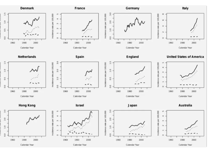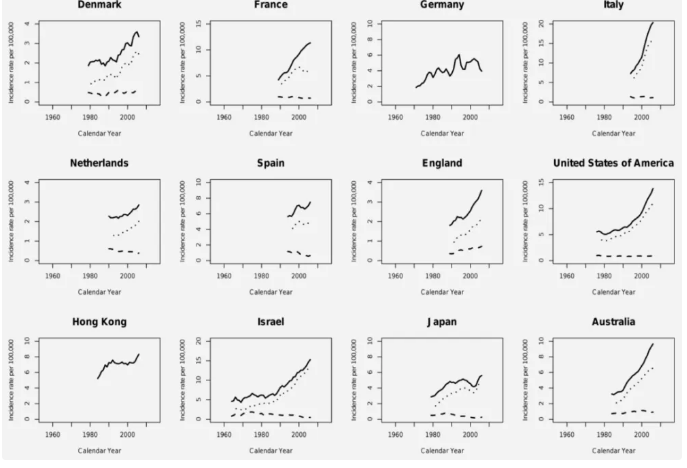 1960 年至 2007 年,在不同國(guó)家和地區(qū),男性甲狀腺癌發(fā)病率的總體趨勢(shì)呈明顯上升,圖片來(lái)源:參考文獻(xiàn)[4]