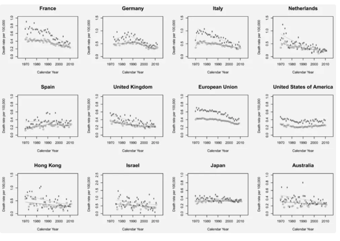 1970 年至 2012 年,在不同國(guó)家和地區(qū),男性甲狀腺癌死亡率穩(wěn)定下降,圖片來(lái)源:參考文獻(xiàn)[4]